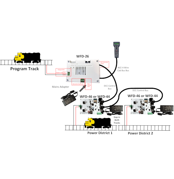 The WFD-26 provides a DCC Control Bus output to its connected Boosters and also provides two NCE Cab Bus connectors. You can connect any NCE Cab devices to these such as a Pro Cabs or Power Cabs (The Power Cabs will act as Pro Cabs), NCE USB Adapter, or Wifitrax WFD-30 or 31.